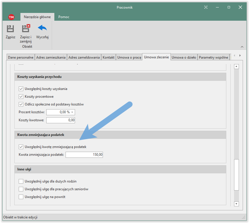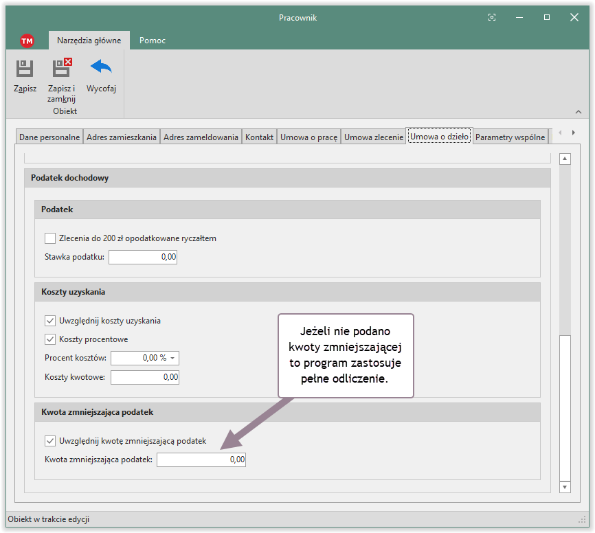Dodano możliwość definiowania wysokości kwoty zmniejszającej podatek dla zleceń, dodatkowe pola dostępne są w oknie edycji pracownika na zakładkach dotyczących umowy zlecenia i umowy o dzieło. Opcja ta dostępna jest tylko w rachunkach wystawianych w nowym systemie płacowym, opcja uwzględniania kwoty zmniejszającej nie będzie dodana do starych formularzy płacowych.