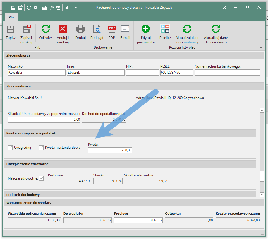 Kwota zmniejszająca podatek w rachunkach do umów zlecenia i o dzieło